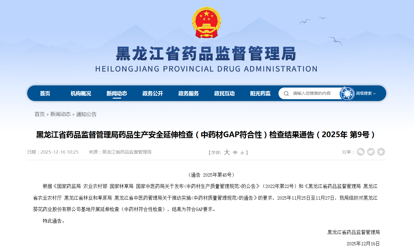 根据《国家药监局 农业农村部 国家林草局 国家中医药局关于发布<中药材生产质量管理规范>的公告》(2022年第22号)和《黑龙江省药品监督管理局 黑龙江省农业农村厅 黑龙江省林业和草原局 黑龙江省中医药管理局关于推动实施<中药材质量管理规范>的通告》的要求,2025年11月25日至11月27日,我局组织对黑龙江葵花药业股份有限公司基地开展延伸检查(中药材符合性检查),结果为符合GAP要求。