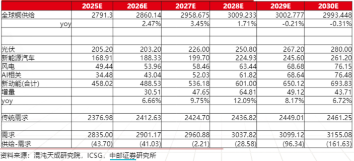 铜:供给刚性与脆弱性并存,需求新质动能催化,供需缺口或逐渐增大;供给侧看,铜矿供应扰动频发,多个核心矿山相继大幅下调产量指引,叠加过去十年资本开支不足,铜呈现供给刚性;需求端看,传统需求相对稳健,AI算力、能源革命等新兴需求方兴未艾,铜被称为“AI时代的新石油”,AI有望成为铜需求的下一个支点。全球铜供需缺口逐渐扩大,铜价主升浪有望来临。据中邮证券数据测算,未来5年全球铜供需缺口逐渐扩大,中长期供需短缺的格局愈加清晰,铜价长期有望向好。