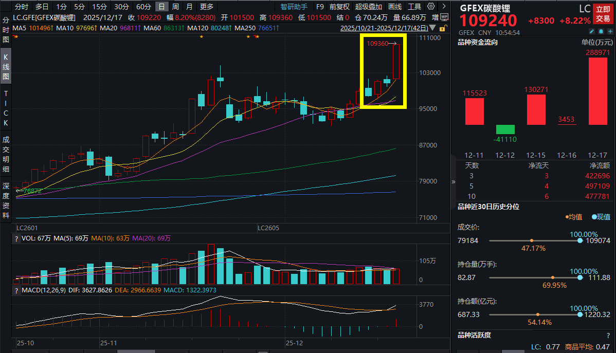 12月17日,碳酸锂期货主力盘中强势拉升,盘中涨幅超8%,创2024年6月以来新高,今年已累计涨超37%。消息面上,继宁德时代枧下窝矿被关停后,“亚洲锂都”宜春又现大动作,宜春市自然资源局拟对高安市伍桥瓷石矿等27宗采矿许可证予以注销。