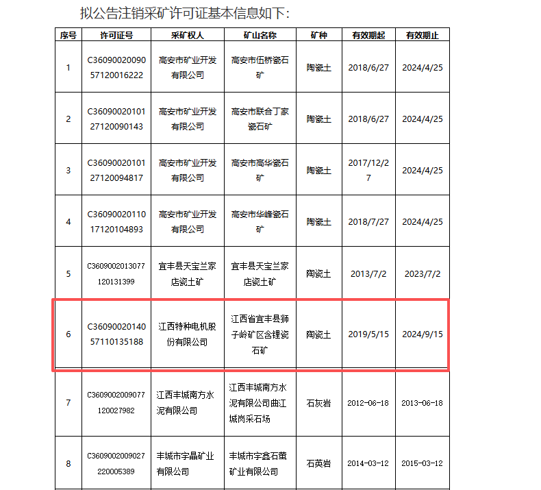江特电机(002176.SZ)的江西省宜丰县狮子岭矿区含锂瓷石矿,是本次公示拟注销的27个采矿权之一。12月16日晚,江特电机公告,公司已向宜春市自然资源局提交了《关于宜丰县狮子岭矿区含锂瓷石矿拟注销公示的异议申请》,提出相关解决方案,尽最大努力争取延续狮子岭矿区采矿证。同时,公司正在全力办理茜坑锂矿投产前的各项准备工作,力争早日投产。