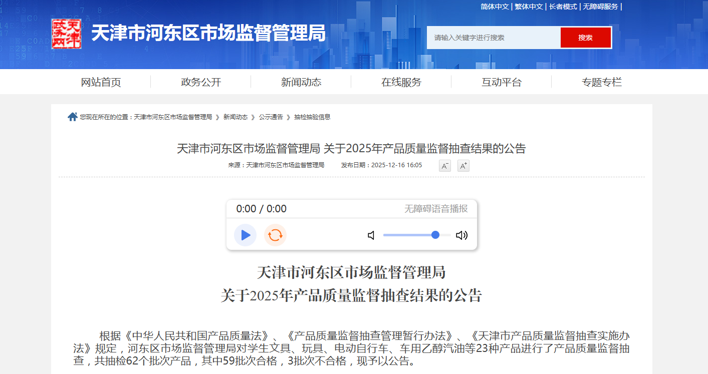 中国质量新闻网讯 近日,天津市河东区市场监督管理局网站发布2025年产品质量监督抽查结果。