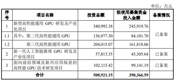 沐曦股份2025年12月11日发布的首次公开发行股票并在科创板上市招股说明书显示,公司拟募集资金390,366.59万元,用于新型高性能通用GPU研发及产业化项目、新一代人工智能推理GPU研发及产业化项目、面向前沿领域及新兴应用场景的高性能GPU技术研发项目。