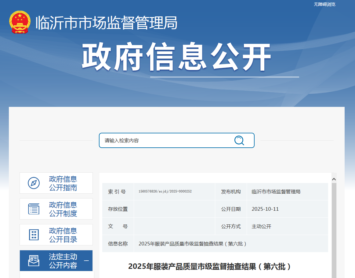 中国质量新闻网讯 据山东省临沂市市场监督管理局网站消息,近日,临沂市市场监督管理局公布2025年服装产品质量市级监督抽查结果(第六批)。本次共抽查销售环节服装产品13批次,未发现不合格产品。