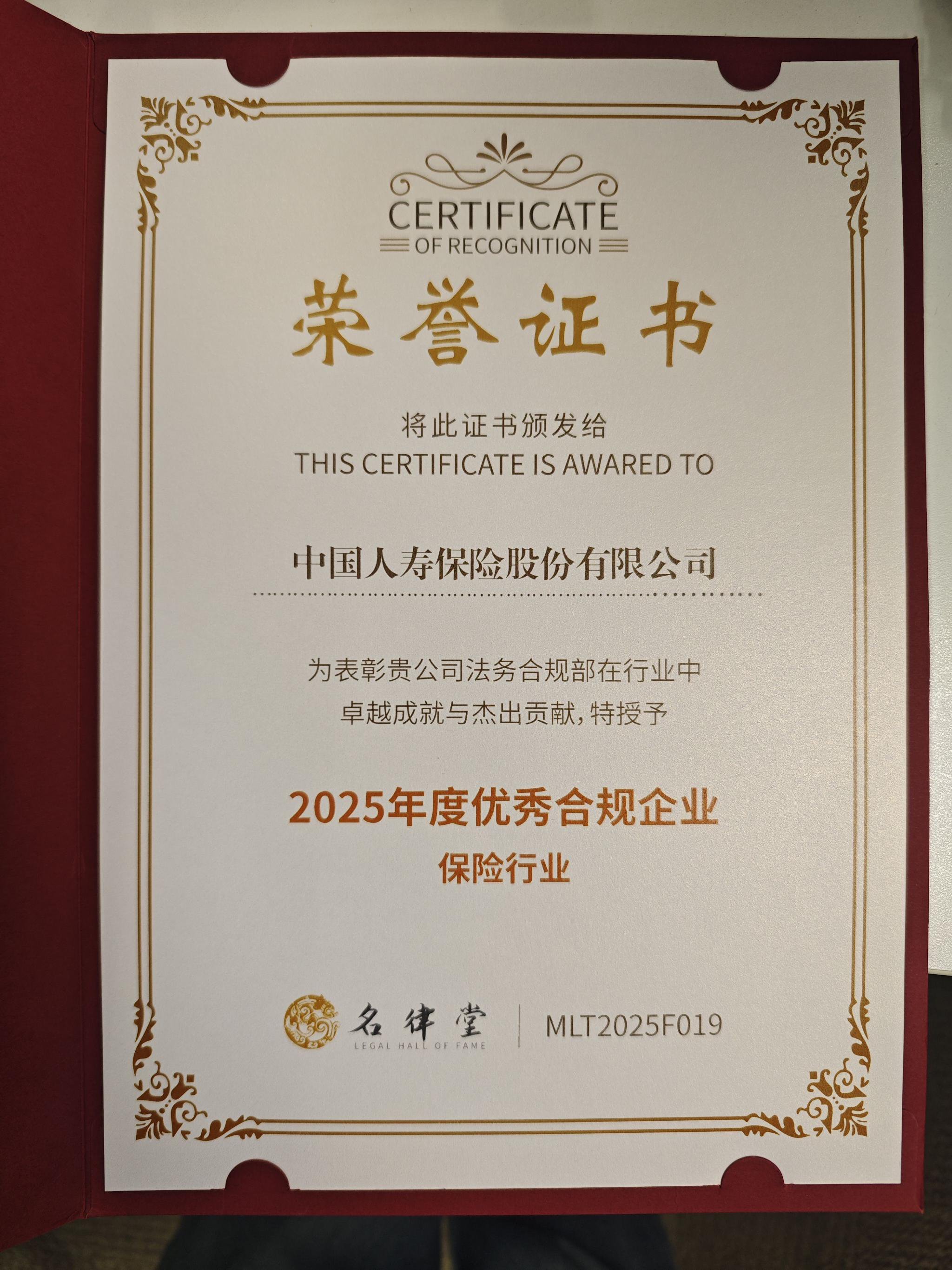 近日,在国内法律行业交流平台名律堂组织的“2025年企业合规先锋榜”评选项目中,中国人寿保险股份有限公司(以下简称“中国人寿”,股票代码:601628.SH,2628.HK)荣膺保险行业“2025年度优秀合规企业”。