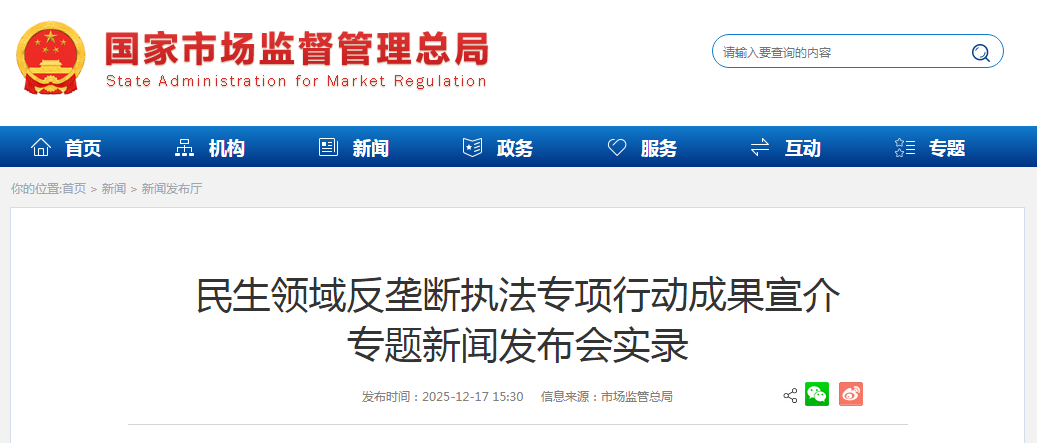 12月17日上午,市场监管总局召开民生领域反垄断执法专项行动成果宣介专题新闻发布会。以下为发布会文字实录: