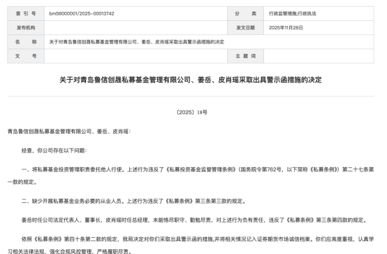 因为违反《私募投资基金监督管理条例》,近期青岛鲁信创晟私募基金管理有限公司(下称“鲁信创晟”)以及时任董事长姜岳、时任总经理皮肖瑶被青岛证监局出具警示函。
