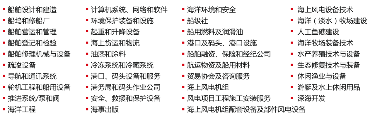 本届展会将汇集20多个国家和地区的500多个品牌联合参展,规划为:船企展区、国际展区、船用设备及先进材料展区、智能船舶展区、船舶动力设备及配套展区、船舶新能源展区、船舶通导展区、智慧海洋科技展区、海洋牧场展区、海上风电展区、邮轮产业展区、游艇展区等,展示海事业上下游产业链的创新产品、技术和服务。