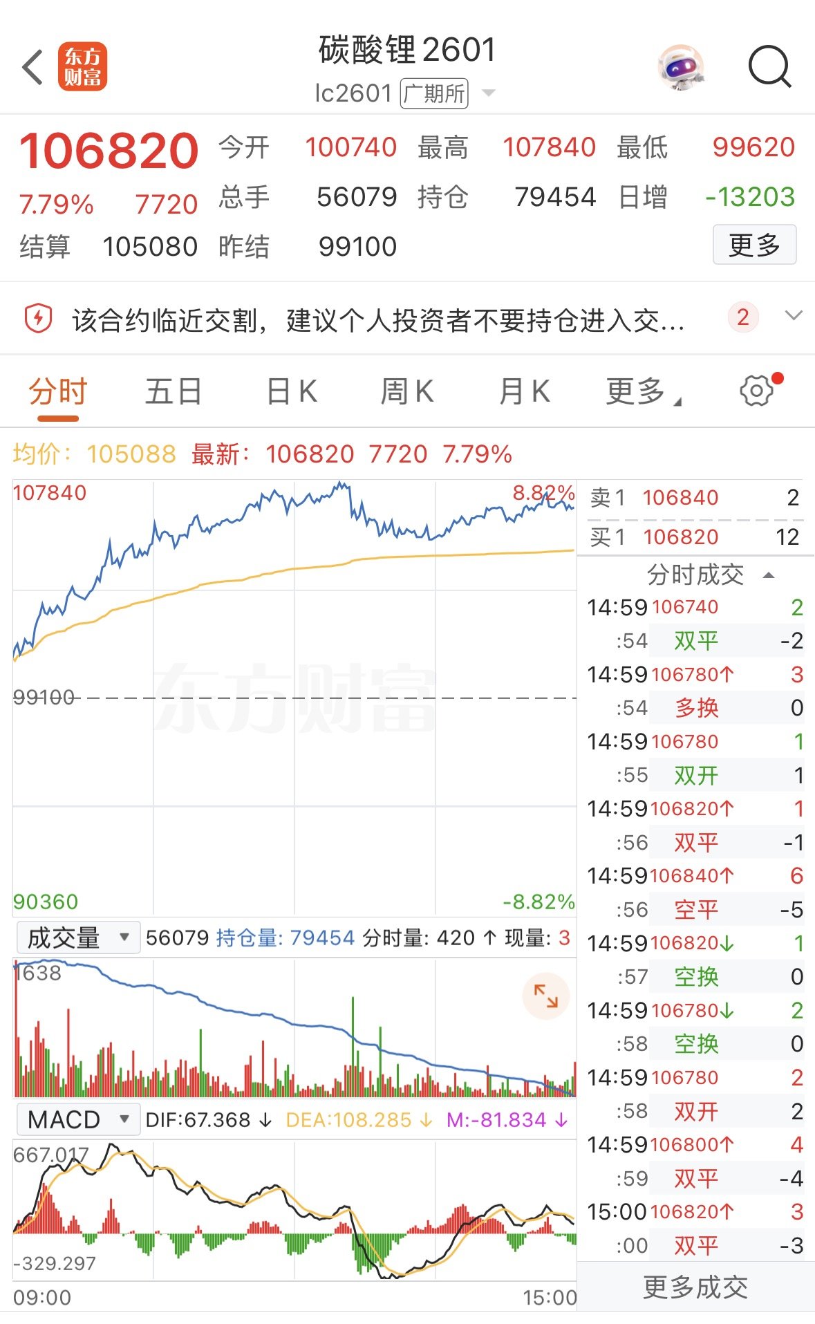 今日,碳酸锂期货主力合约拉涨,盘中最高涨超8.8%,最高报10.78万元/吨,创2024年5月以来新高。受期价大涨影响,锂矿概念板块大涨4.3%,盛新锂能在早盘11点率先冲板并封板成功,随后锂电板块的天齐锂业、中矿资源等纷纷大涨,板块内一片飘红,截至收盘,板块以5.98%的涨幅名列行业板块第一。
