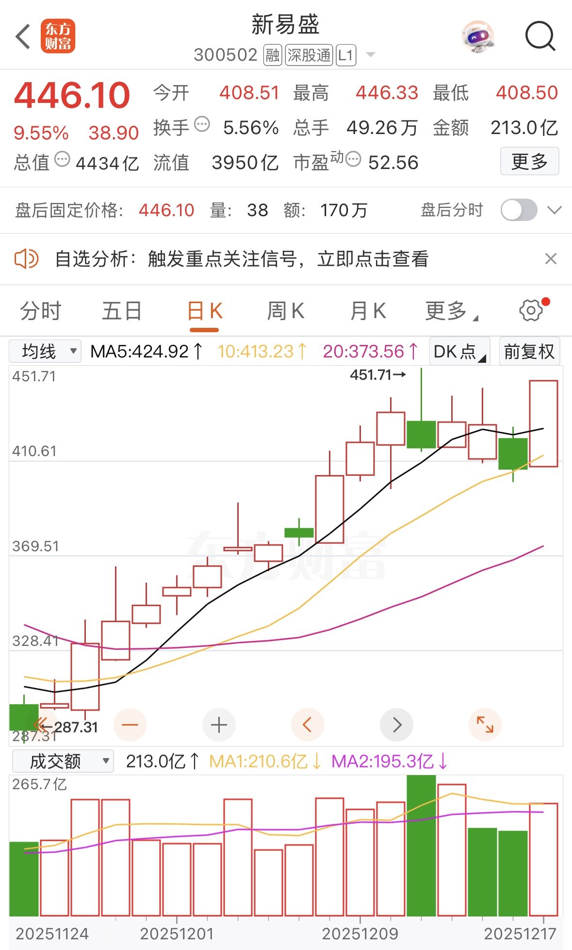 跟着大盘节奏,四川板块今日上演“震荡翻盘”戏码:早盘一度走低,午后两点左右发力回升,最终震荡走高。板块内“领头羊”新易盛表现抢眼,收盘报446.10元/股,成交额突破200亿元,与排名第二的百利天恒之间的股价差距扩大至近百元。