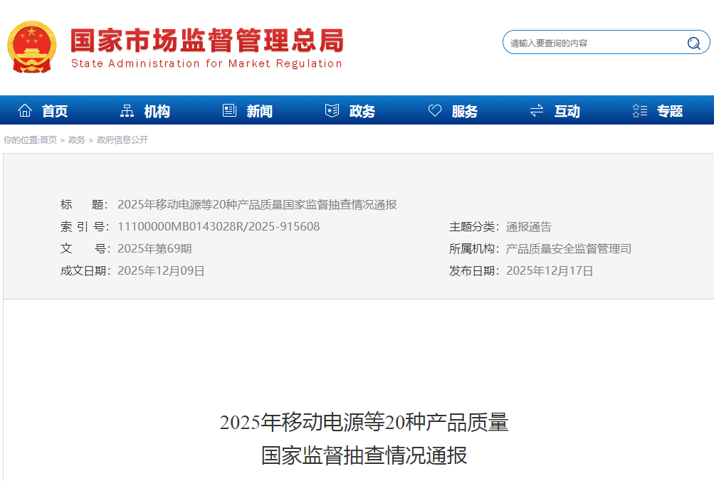 近期,市场监管总局组织开展移动电源等20种产品质量国家监督抽查。现将抽查情况通报如下: