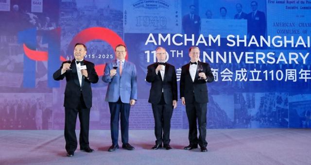 今年5月,郑艺(左一)在上海美国商会成立110周年的庆祝活动上。