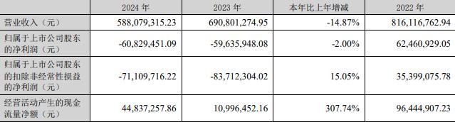 据公司2024年年报,报告期内,公司实现营业收入5.88亿元,同比减少14.87%;归属于上市公司股东的净利润-6082.95万元,2023年为-5963.59万元;归属于上市公司股东的扣非净利润为-7110.97万元,2023年为-8371.23万元;经营活动产生的现金流量净额为4483.73万元,同比增长307.74%。