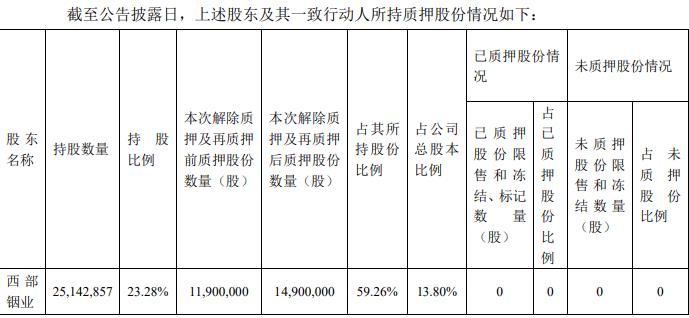 公示7月19日披露关于控股股东所持股份解除质押及再质押的公告,近日接到公司控股股东西部铟业的通知,获悉其将持有公司股份进行了解质押及再质押的手续。截至公告披露日,西部铟业本次解除质押及再质押后质押股份数量14,900,000股,占其所持股份比例59.26%,占公司总股本比例13.80%。