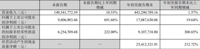 据公司2025年第三季度报告,本报告期,公司实现营业收入1.50亿元,同比增长10.53%;归属于上市公司股东的净利润980.69万元,同比增长691.66%;扣除非经常性损益后的净利润625.47万元,同比增长222.00%。