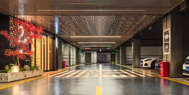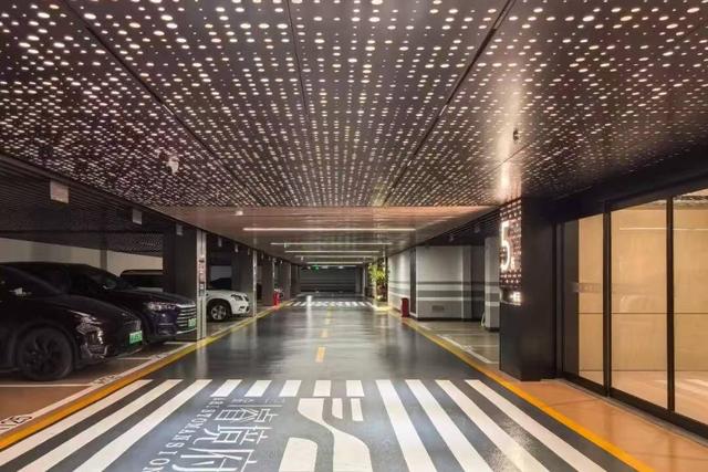 ·金格栅车库——南部新城仅一家吊顶设计:车库顶部采用星空顶+木质格栅全吊顶,车道星空顶与车位格栅呼应,立柱全铝板包覆。即便人防车库也执行同一标准,打造酒店式归家体验