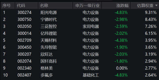 电池50ETF(159796)标的指数成分股方面多数回调,阳光电源、天赐材料、多氟多等跌超4%,宁德时代、三花智控、亿纬锂能(维权)等跌超2%,先导智能、国轩高科等跟跌。