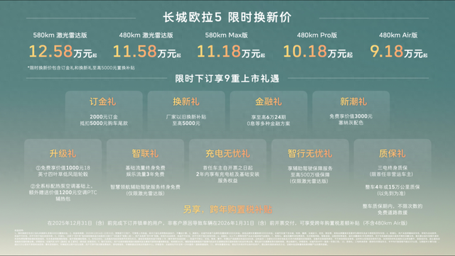 12月16日,长城汽车欧拉品牌全新A级纯电SUV——长城欧拉5正式上市。新车共推出5款配置,建议零售价区间为 9.98万至13.38万元,限时换新价9.18万元起(限时换新价包含“订金礼”和“换新礼”至高5000元以旧换新补贴)。即日起至2025年12月31日,用户下订并锁单即可尊享包含订金礼、换新礼、智行无忧礼在内的9重上市好礼,以及跨年购置税补贴(不含480km Air版)等丰厚购车权益。凭借诚意十足的价格权益与越级产品力,长城欧拉5致力于成为全球年轻用户的“严选搭子”。