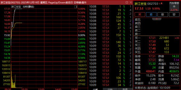 盘初,智能驾驶概念反复活跃,浙江世宝(002703)4连板,超22万手买单封死涨停,豪恩汽电、路畅科技、万集科技、索菱股份、均胜电子跟涨。