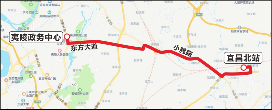 线路由宜昌东站发车,经东临路、花溪路快速路至宜昌北站往返运行。
