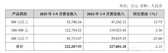 财报数据显示,今年前三季度,金徽酒营业收入为23.06亿元,同比下滑0.97%,归母净利润为3.24亿元,同比下降2.78%。其中公司营收主力100-300元产品前三季度营业收入为12.28亿元,同比增长2.36%,300元以上产品实现收入5.37亿元,同比增长13.75%,为公司主要增长动力,而100元以下产品同比下降23.60%至4.57亿元,为金徽酒唯一下降的产品档次。