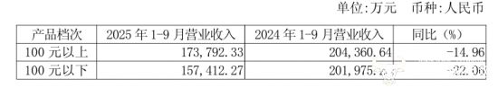 此外,口子窖三季度毛利率同比减少3.81个百分点至70.96%,但仍高于老白干酒66.29%的毛利率,盈利能力更强。而从产品结构来看,老白干酒三季度100元以上的产品收入为17.38亿元,同比下降14.96%,100元以下的产品收入同比减少22.06%至15.74亿元,二者营收规模比较接近。