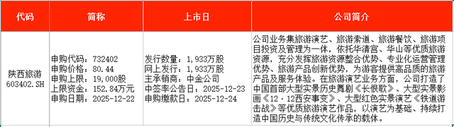 从时间表看,新广益(301687)、陕西旅游(603402)将在本周一(12月22日)申购;蘅东光(920045)将在本周二(12月23日)申购。