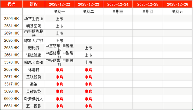 港股方面,Wind数据显示,本周(12月22日至12月26日)林清轩(02657.HK)、美联股份(02671.HK)、迅策(03317.HK)、英矽智能(03696.HK)、卧安机器人(06600.HK)、五一视界(06651.HK)将在周一至周二申购。