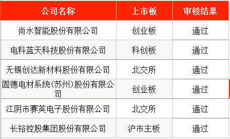其中,拟在上交所科创板IPO的中电科蓝天科技股份有限公司(下称“电科蓝天”)、拟在沪市主板IPO的长裕控股集团股份有限公司(下称“长裕集团”);拟在深交所创业板IPO的深圳市尚水智能股份有限公司(下称“尚水智能”)、固德电材系统(苏州)股份有限公司(下称“固德电材”);拟在北交所IPO的无锡创达新材料股份有限公司(下称“创达新材”)、江阴市赛英电子股份有限公司(下称“赛英电子”)等,均成功过会。
