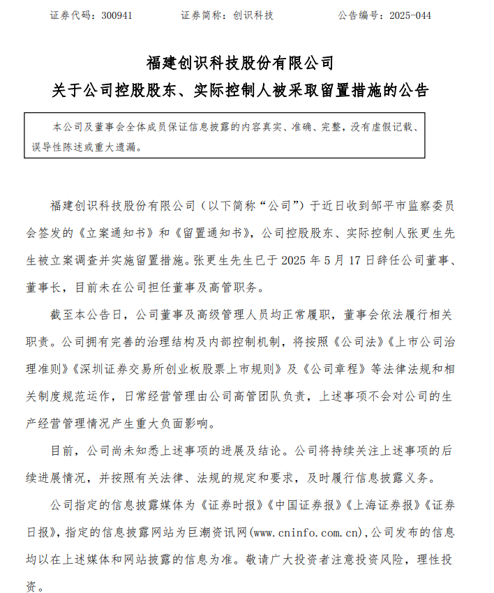 12月22日,创识科技(300941.SZ)公告称,公司于近日收到邹平市监察委员会签发的《立案通知书》和《留置通知书》,公司控股股东、实际控制人张更生被立案调查并实施留置措施。张更生已于2025年5月17日辞任公司董事、董事长,目前未在公司担任董事及高管职务。