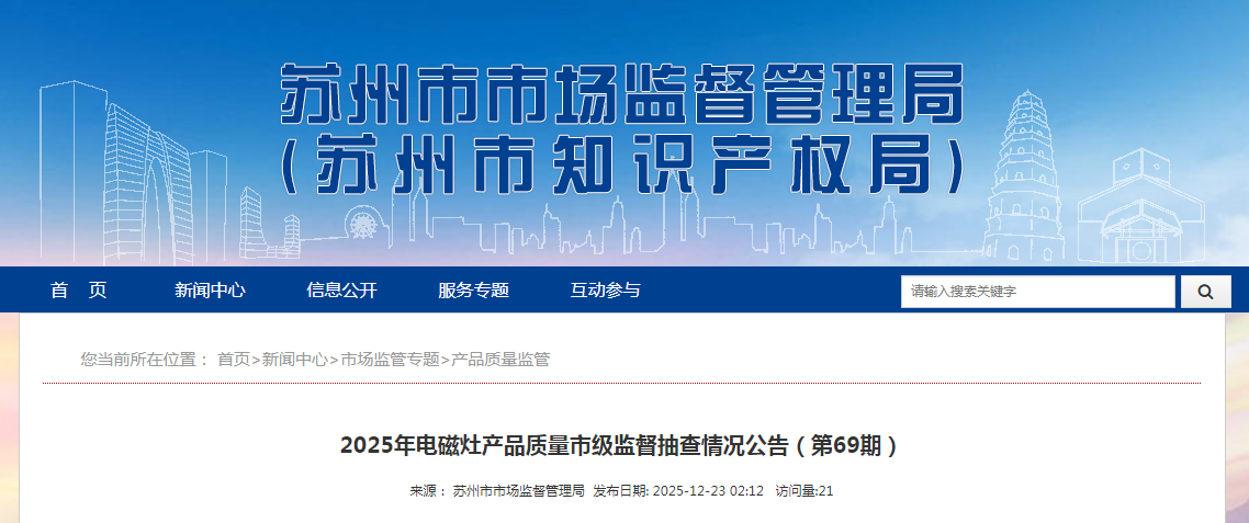 中国质量新闻网讯 据苏州市市场监督管理局网站消息,根据相关规定,2025年二季度,苏州市市场监督管理局委托苏州市产品质量检验院有限公司承担电磁灶产品质量定期监督抽查并发布2025年电磁灶产品质量市级监督抽查情况公告(第69期)。