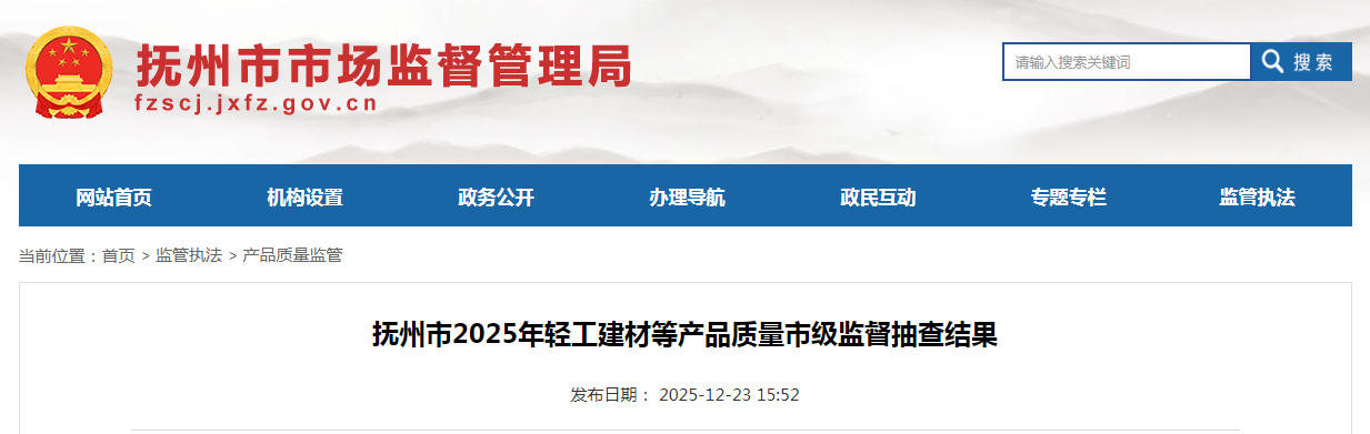 中国质量新闻网讯 据江西省抚州市市场监督管理局网站消息,2025年,抚州市市场监督管理局对全市轻工建材等产品质量进行了监督抽查。