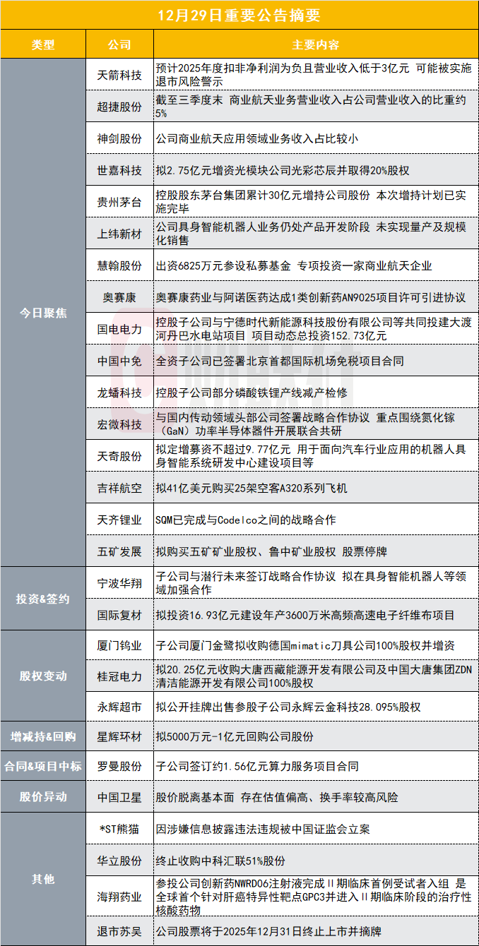 天箭科技(002977.SZ)公告称,公司相关军品2025年度进行了价格审核,与客户签订了《军品价格调整补充协议》,对以前年度销售合同进行了调整,预计调减当期营业收入约2.56亿元,影响净利润约-2.09亿元。根据相关规定,公司预计2025年度扣非净利润为负且扣除后营业收入低于3亿元,股票交易可能被实施退市风险警示。