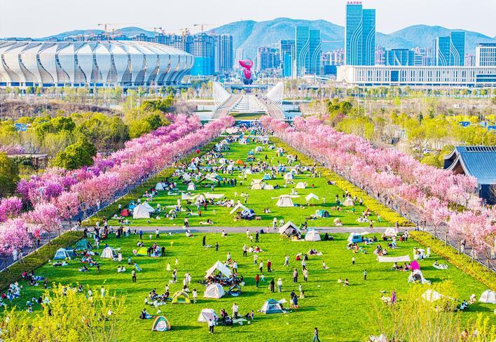 黄石奥体公园内,市民在草坪上露营玩耍、乐享周末。