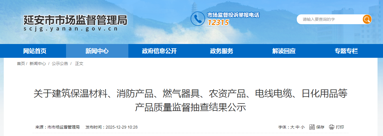 中国质量新闻网讯 据陕西省延安市市场监督管理局网站消息,按照2025年产品质量监督抽查计划安排,延安市市场监督管理局对全市生产流通领域的建筑保温材料、消防产品、燃气器具、农资产品、电线电缆、日化用品等产品进行了监督抽查,抽取样品165批次,经检验,合格161批次,不合格4批次。