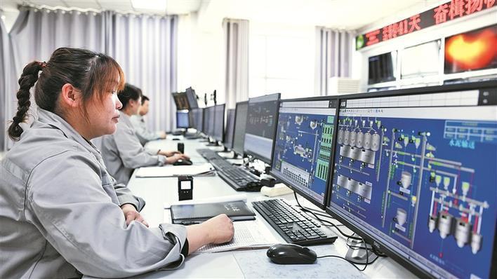 在新疆青松建材化工(集团)股份有限公司水泥分公司中控室内,工作人员在调度日常生产(资料图片)。青松建化以智能制造为主攻方向、以信息化技术集成创新为突破口,大力推进“互联网+制造业”深度融合发展,以数字技术赋能传统制造业转型升级。(据本报资料库)
