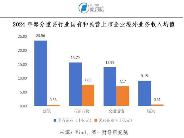 其中,就建筑、石油石化、交通运输以及煤炭四个较为典型的重资产行业来说,相较于民营企业,国有企业境外业务收入均值明显处于更高水平。