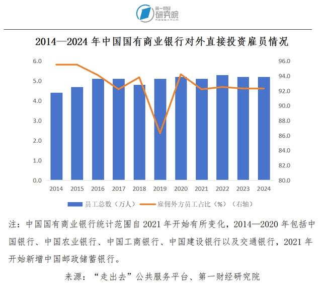 除此之外,2014—2020年,中国国有商业银行持续进行海外投资,广泛布局,海外服务能力持续增强。2020年末,中国国有商业银行在海外开设分行数量由2014年末的72家上升至105家。在中国邮政储蓄银行加入统计样本后的2021—2024年,国有商业银行的海外投资布局则没有太大的变化。这些银行的海外本土化经营同样值得关注。2021—2024年数据显示,这些国有商业银行雇佣外方员工占比维持在92%以上。
