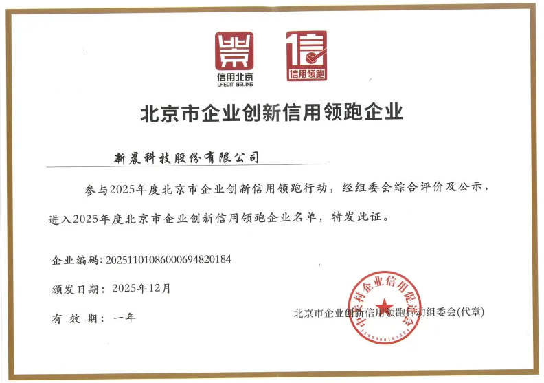 2025年12月初,新晨科技股份有限公司(股票代码:300542)再度荣获“年度北京市企业创新信用领跑企业”称号。多年来,凭借严格遵循国家法律法规,坚持诚信经营,积极履行社会责任,新晨科技赢得了客户、合作伙伴及社会各界的广泛信赖。自2021年以来,已连续5年获此荣誉,彰显了其在信用承诺履行与社会责任实践方面的突出表现,也是对其信用管理体系成效的有力证明。