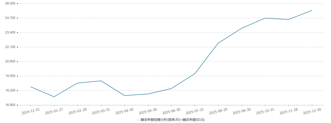 2025年,A股市场的持续上涨离不开增量资金的持续流入,其中融资余额为A股市场2025年最重要的增量资金来源。Wind数据显示,截至12月30日,A股两融余额报25552.84亿元,融资余额报25385.25亿元,均创历史新高,2025年以来融资余额增加6843.80亿元。