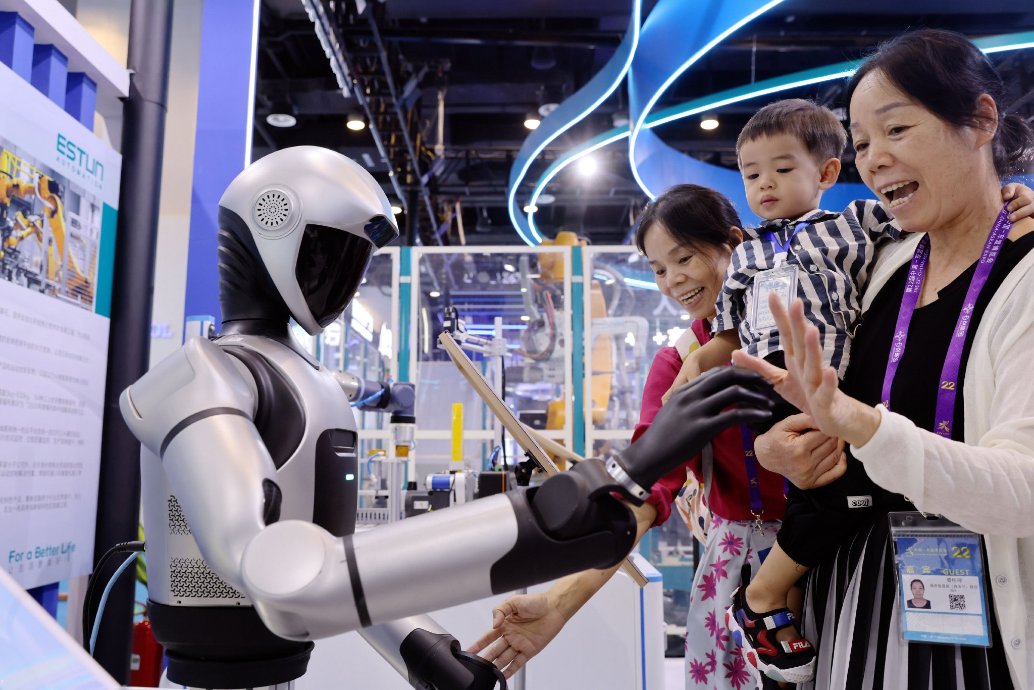 展会上,观众与埃斯顿机器人互动。