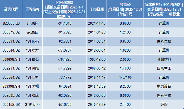 其中,广道退(920680)领跌2025年A股市场,累计下跌94.18%。东通退(维权)(300379)2025年跌幅同样超过90%,累计下跌91.78%。