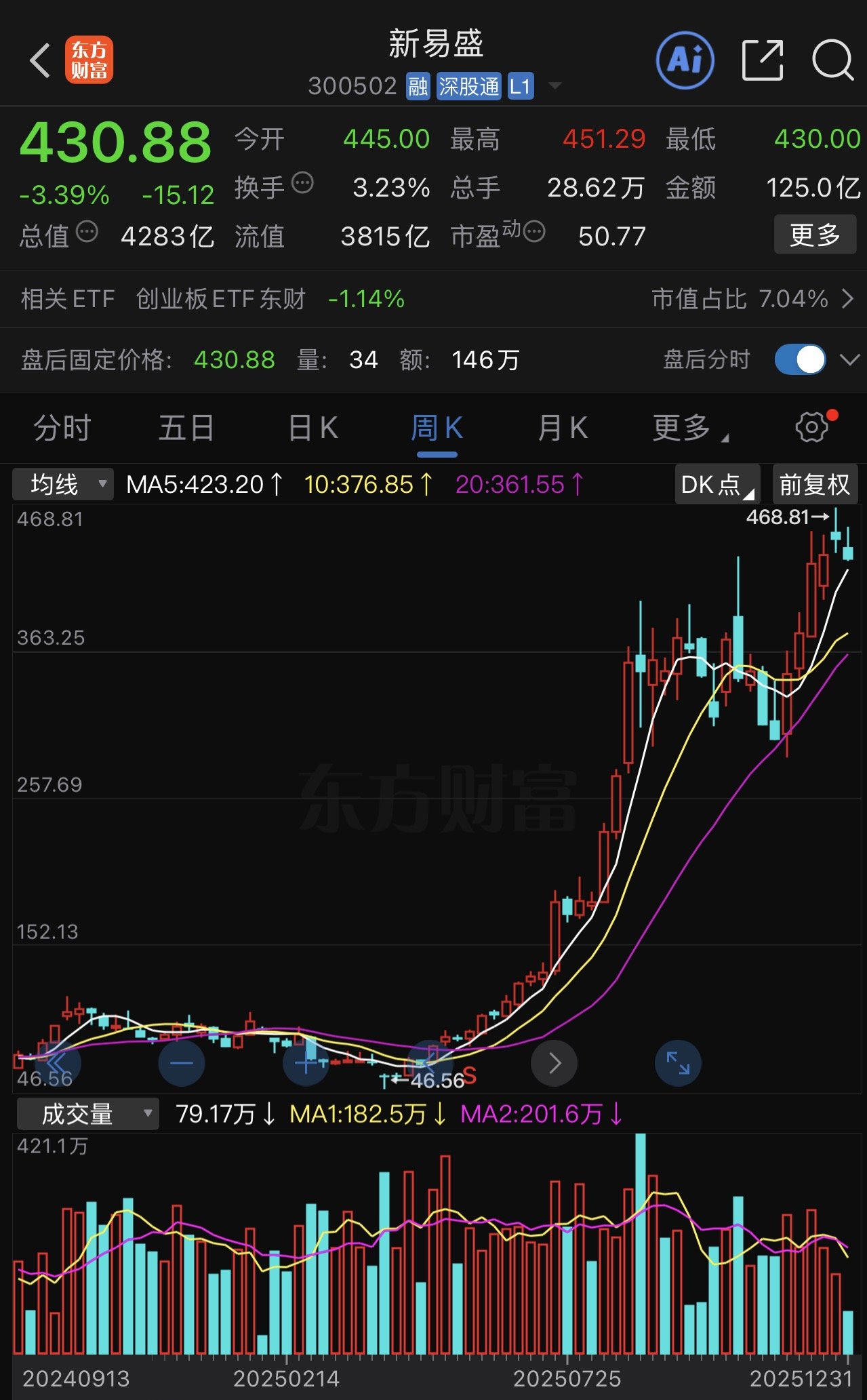 新易盛资金交易也非常活跃。根据同花顺数据,新易盛今年以来累计区间成交额为2.31万亿元,日均换手率5.53%,并成为A股年度融资净买入最高的股票,融资净买入额超过170亿元。
