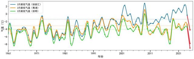 2025年2月8日-9日,本市遭遇强寒潮,全市11个国家基本气象站的日极端最低气温在-4.2℃至-9.0℃之间;其中青浦和崇明两站日极端最低气温分别达-7.8℃和-9.0℃,均打破其1961年建站以来2月极端最低气温纪录。市区日最低气温降至-4.2℃,为1991年以来的2月新低。