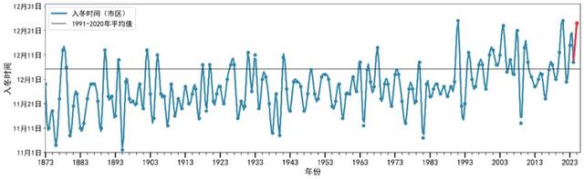 12月以来,冷空气较弱,本市气温持续偏高,直至12月24日才进入气象意义的冬天(连续5天日平均气温低于10℃),为1873年以来历史第二晚(仅早于1991年和2021年的12月25日)。