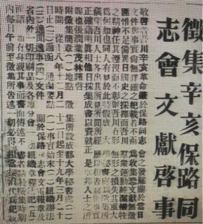 十余年后,张澜对文化传承的坚守愈发坚定。1929年冬,时任成都大学校长的他与叶茂林在《国民公报》连续刊登《征集辛亥保路同志会文献启事》,为抢救川蜀革命记忆奔走呼号。启事开篇即言:“敬启者,吾川辛亥革命肇于保路同志会之发难,关于当日文件与事实,尚无详确之纪载。若不亟为收集,恐文献无征,匪惟不足备异日国史之采择;而吾川群众运动纯洁牺牲之精神,任其湮没而不彰,则吾川有形无形之损失其重大为何如也。”字里行间,满是对历史责任的担当。他们特设征集所于成都大学秘书处,广邀川人贡献所见所闻、所藏文献,涵盖事实始末、组织章程、文电报章乃至逸文逸事,甚至为亲历者提供面述记录的便利。这份执着,让一段关乎四川近代命运的珍贵历史得以留存。