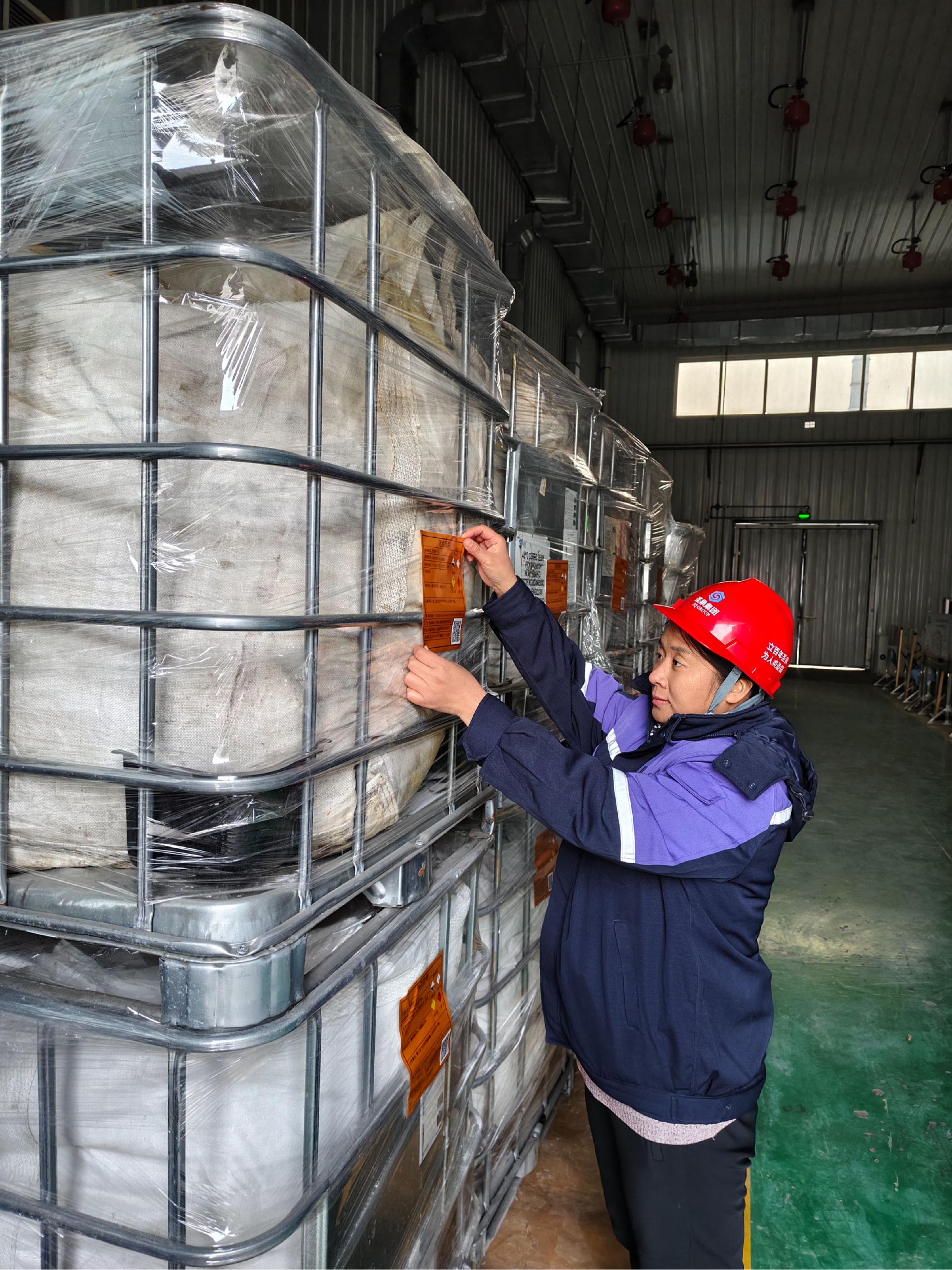 图为企业环保管理人员按照危险废物“五即”规范管理要求,对产生的废活性炭开展危险废物标识张贴和入库管理工作。