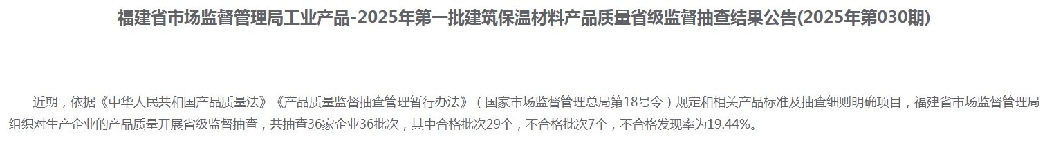 对建筑保温材料(有机类)产品质量开展省级监督抽查。本次共抽查35家生产企业35批次,其中7批次不合格,不合格发现率为20%。