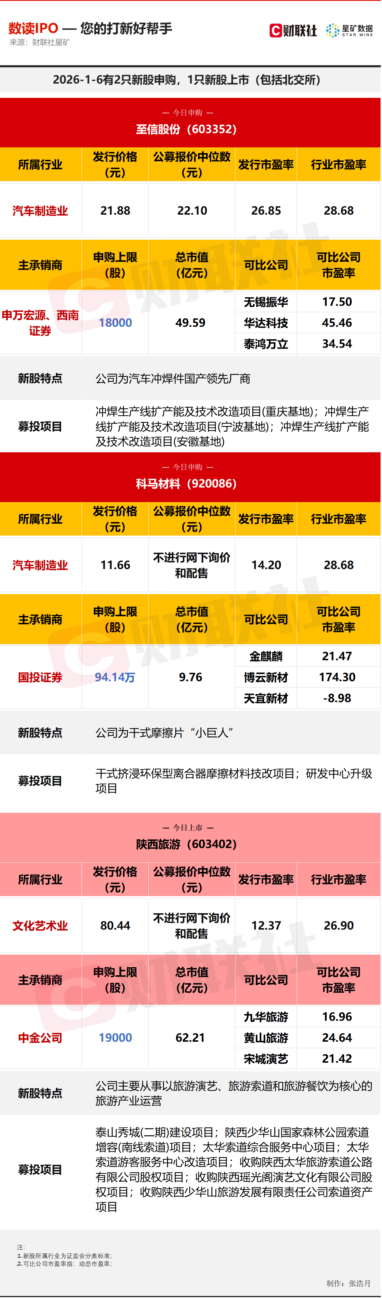 财联社1月6日讯,作为2026年首批面世新股,今日共有2只新股申购,分别为沪市主板的至信股份,北交所的科马材料;1只新股上市,北交所的科马材料。