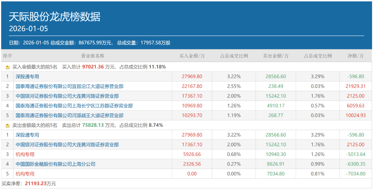 图:1月5日天际股份龙虎榜数据来源:同花顺财经