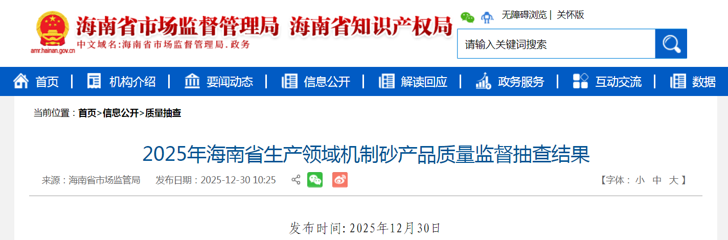 中国质量新闻网讯 据海南省市场监督管理局网站消息,2025年,海南省市场监督管理局对全省生产领域机制砂产品进行了监督抽查。本次抽查了20批次产品,经检验,未发现不合格产品。